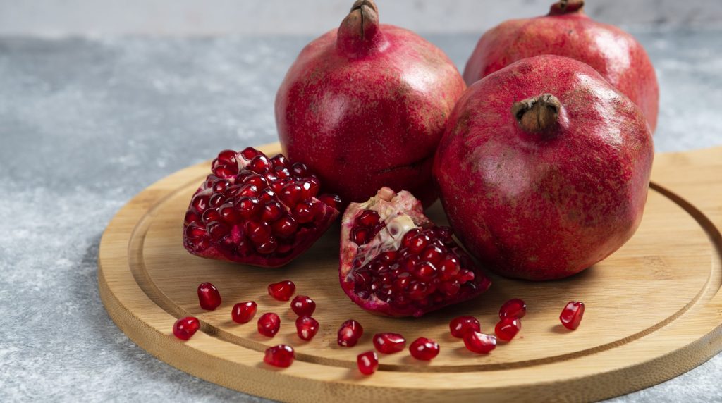 A shrub native to central Asia and northern India, pomegranate trees bear fruits that hold an important key to beauty and wellness. The round, reddish-brown fruits grow from the branches have a hard, husk-likes shell exterior and an interior filled with edible seeds. Depending on their size, each bulbous fruit has anywhere from 150 to 1500 seeds (the average is around 600). The seeds—called arils—are small in size, resembling a smooth ruby, and are filled with vibrant nutrients: vitamin C, vitamin K, folate, potassium, antioxidants. A bright purple-red juice flows from the seeds when they are punctured, a color that’s attributed to the high presence of ellagitannins and anthocyanins, which studies show help to ease inflammation. The juice has long been a touted wellness beverage for its studied impact on lowering blood pressure, lessening hypertension, and promoting better vascular health.